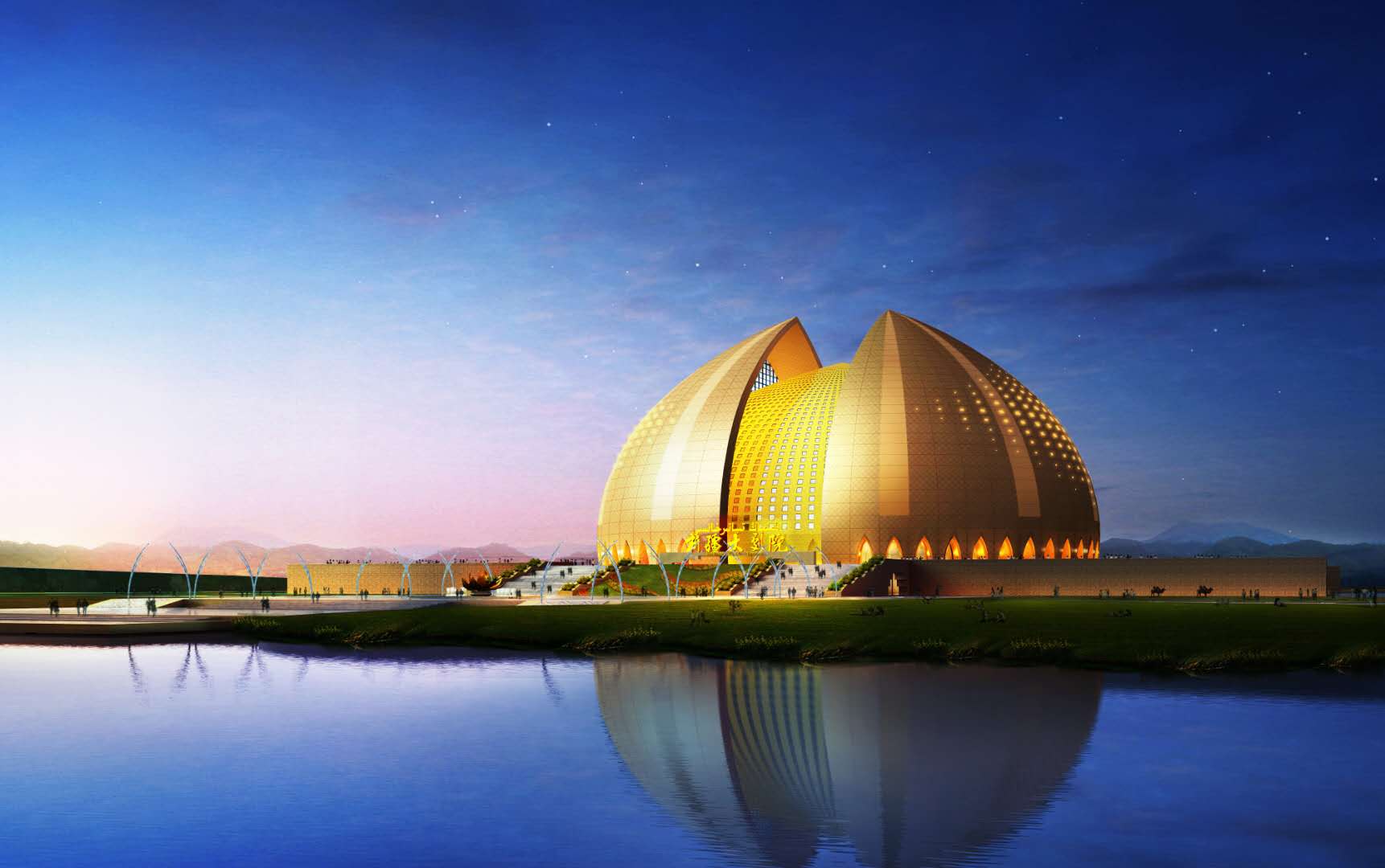 大剧院主体建筑坐落在平缓的台基上,以盛开的天山雪莲为原型,通过抽象与创新的设计手法,形成里外套层的穹顶造型的主体形象。外饰面通过黄褐色金属光泽的铝板材质表达出轻盈、时尚的品质,内核金色砖纹肌理表达出浓烈的新疆地域文化特征。