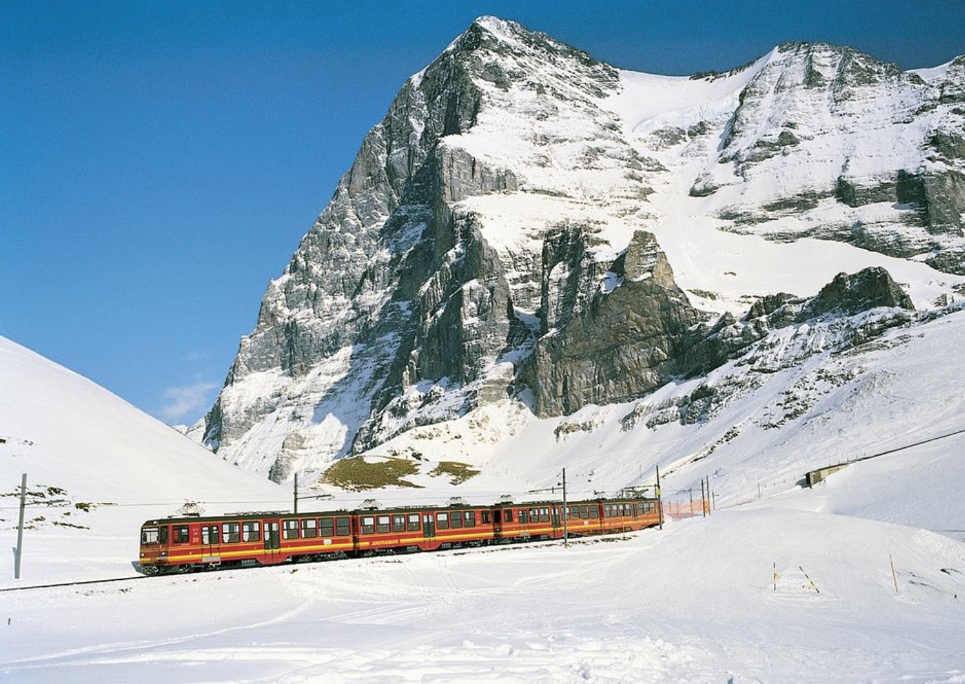 少女峰除了有或秀美或壮丽的阿尔卑斯山地景色可观赏外,运送游客上山的少女峰登山铁路本身就是20世纪初人类的一大工程奇迹。这条铁路修筑于1896至1912年间,一共用了16年时间,而为了避免滑坡和风雪,路线有相当长的部分是在艾格峰腹地内的隧道中挖掘而出的,这项上世纪初年实施的工程,直到科技高度发达的今天,版权所有山东聊城聊之旅国际旅行社有限公司,转载必究!仍能让乘坐者感叹当年开拓者们的无比勇气和毅力。上山时,齿轨火车会在两个位于隧洞中的小站稍停五分钟左右,乘客可以下车,通过隧洞中凿石开出的几扇大玻璃观景窗,欣赏隧洞外面阳光灿烂的冰雪世界。