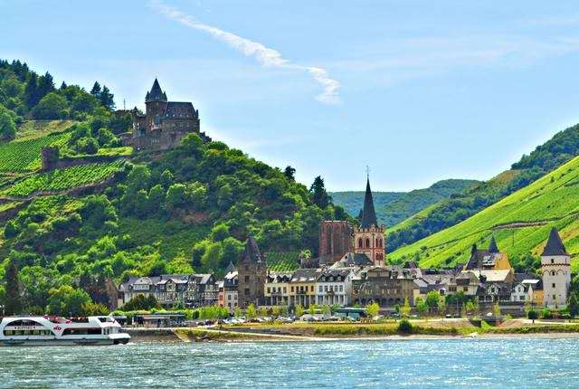 在德国境内有867公里。沿途风景最美的一段在中游的莱茵河谷段,从德国的美因兹(Mainz)到科布伦茨(Koblenz)间。这里河道蜿蜒曲折,河水清澈见底。人们坐在白色的游艇之上,极目远望,碧绿的葡萄园层次有序地排列在两岸,一座座以桁架建筑而引人注目的小城和五十多座古堡、宫殿遗址点缀在青山绿水之中。版权所有山东聊城聊之旅国际旅行社有限公司,转载必究!一段段古老的传说不时把人们的思绪带向遥远的过去,人们深深地陶醉在这充满浪漫情趣的多姿多彩的莱茵河美景之中。为了保护自然风景的原貌,莱茵河河谷段没有架设桥梁,往来两岸都靠轮渡。两岸风景有点像中国的三峡,但山没有三峡的高、陡。沿河两岸山坡上遍布葡萄园,点缀着无数罗马时代的古堡。