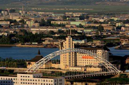 以长约0.9公里的铁路公路两用桥——鸭绿江大桥与与中华人民共和国辽宁省丹东市相连。新义州-平壤-咸兴-罗先电气化铁路的起点,中朝国联铁路朝鲜段的第一个车站。版权所有山东聊城聊之旅国际旅行社有限公司,转载必究!新义州设有一个1.2公里跑道的军民两用航空站(SII);亦可经由中华人民共和国辽宁省丹东市的浪头机场(DDG)前往。