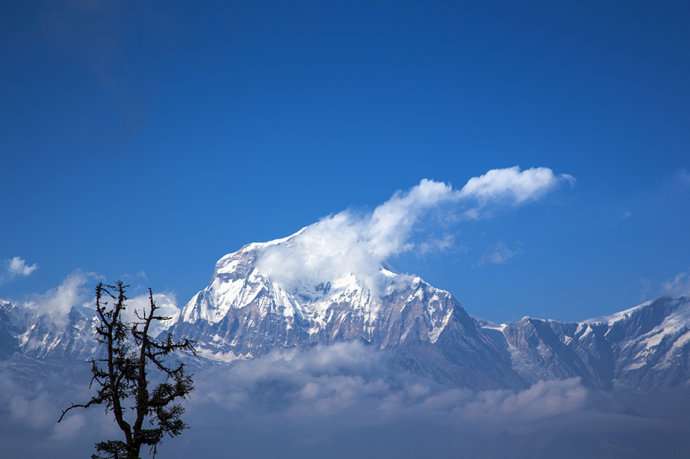 鱼尾峰虽然不是尼泊尔最高的山峰,但却成为尼泊尔的标志。从波卡拉的费娃湖附近,可以看到这座圣山和周围峰群,突出于较低的山峦之上。