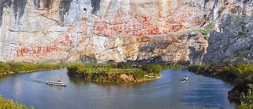 这些图像在崖壁上错综呈现,组成一幅幅完整的图画——典型的组合是一个高大魁伟、身佩刀剑的正身人像居中,脚下有狗,身旁有铜鼓,四周有众多动作一致的侧身人像。整个场面布局规整,疏密相间,动感十足,极像一场庄严又欢快的祭祀活动。这些色彩鲜艳、不断重复的画面,与山崖、河流和台地共同构成了神秘而震撼的文化景观,被称为“崖壁画的自然展览宫”、“断崖上的敦煌”。