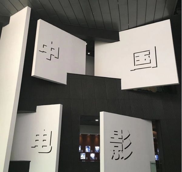 中国电影博物馆内部采用黑、白、灰三色作为基调,在主体建筑的前方,银幕与广场上一道断续的斜墙构成了形如咔打板的平面组合。建筑采用黑色作为基础色,并使用镂空图案的金属板作为外层装饰。在黑色背景上,四个立面根据建筑的内部公共空间的位置分别开辟一片大型彩色玻璃面。