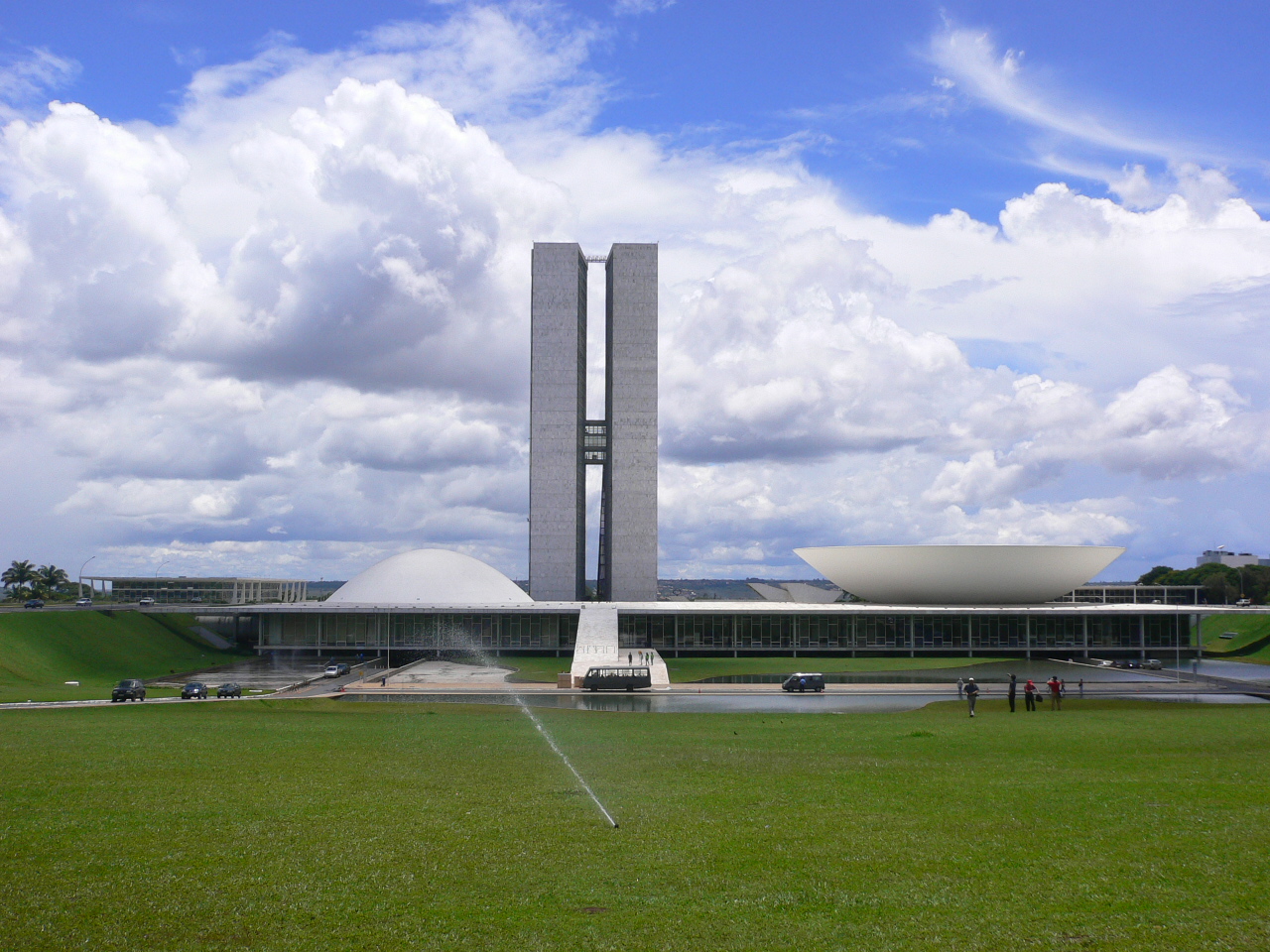 巴西利亚是一座只有30多年历史的新城,没有一处古代建筑。有名的现代建筑主要集中在城市的核心——三权广场。国会大厦是两座并列的28层长方形大楼,是全城最高的建筑。法律规定,任何建筑物都不得超过它的高度。两座大楼之间由一条过廊连通,形成一个“H”形,这是葡萄牙文“人”的第一个字母,表示一切为了人。右侧大楼为众议院大厦,楼侧是一个仰天的“大碗”,意为“广听民意”;左边是参议院大厦,侧旁亦有一个“大碗”,不过是倒扣,象征“集中民意形成决议”。