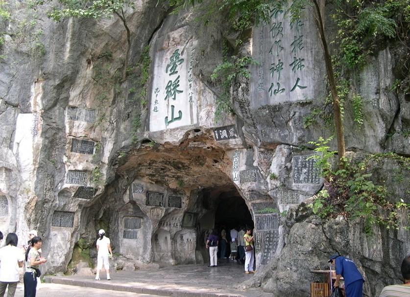 风洞之南,即前洞,是叠彩洞,因山得名,古称叠彩岩。高3.65米,宽5.6米,长12.5米。面积约70平方米。洞口有陈毅名句"愿作桂林人,不愿作神仙"的题刻,以及壁有佛像90余尊,为唐宋物,故又名福庭洞。