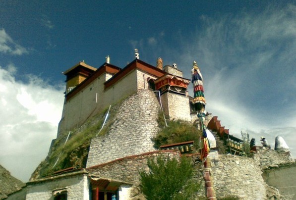 雍布拉康据传说建于公元前二世纪,那个晕头晕脑就做了吐蕃第一代藏王的聂赤赞普,除了成为“脖子作宝座的英王”外,还得到了这座特意为他而建的三层“红柳香莎宫”。这故事其实听着挺耳熟,俗点儿说就跟听到谁谁忽然间中大奖,一下子就奔有房有车的“高级阶段”的故事似的,现在宫殿二层墙壁的壁画上还绘有这段传奇故事,让我一类的后人为之景仰不已。由此,这座宫殿也成为历代吐蕃赞普的王宫,直到第三十三代赞普松赞干布统一高原,将王都迁往拉萨。不过,即使英明神武如松赞干布,也不敢忘了雅砻这块吐蕃的根本之地,不时还回来居住,据说文成公主远嫁到西藏后的第一个夏天就是在雍布拉康度过的。雍布拉康还有一神奇之处,自第一代聂赤赞普以来,历代赞普皆以苯教为护国教,直到第二十八代赞普拉妥妥日年赞时期。传说有一日天降“神物”于雍布拉康的顶上,内有经书、法器和咒语若干,可是当时谁也不识这些东西的奇妙,只知是些好东西,于是将之供奉起来,还取了一名叫“宁波桑哇”,意思是秘室。直到后来许多年以后,才有后人识出密室中的《诸佛菩萨名称经》等珍贵经卷,方悟出其实佛教在松赞干布时期以前早就进入了西藏了,只是因当时地上的苯教势力太盛,才只好先“空投”,再“埋伏”,以待后日。该宫殿随之成为佛教圣地,也由此变成了一佛殿,成为许多高僧大德修行之地,也成为许多“伏藏”的发现和埋藏之地。