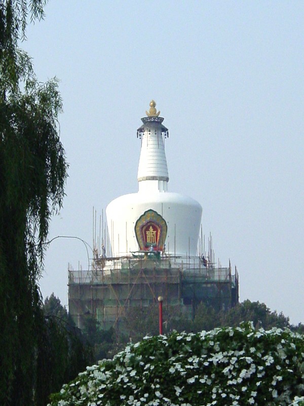 北海白塔—藏传喇嘛塔 于清初顺治八年(1651年),是一座藏式喇嘛塔。据建塔石碑记载,当时"有西域喇嘛者,欲以佛教阴赞皇猷,请立塔寺,寿国佑民",得到皇帝的恩准,于是修建了永安寺和白塔。塔高35.9米,上圆下方,富有变化,为须弥山座式,塔顶设有宝盖、宝顶,并装饰有日、月及火焰花纹,以表示"佛法"象日、月那样光芒四射,永照大地。塔身正面有一盾形小龛,内塑红底黄字的藏文图案,含"吉祥如意"之意。此龛俗称"眼光门",又叫"时轮金刚门"。1679年该塔被地震所毁,次年重建。1976年唐山地震波及北京,塔顶被损。在修复时,发现塔内主心木中藏有一个二寸见方的金漆盒子,盒盖绘有太极图,盒内藏有两"舍利",证明此塔是一座舍利塔。该塔矗立于琼岛顶峰,绿荫拥簇,巍峨壮美,引人瞩目。这种象征神权的建筑物--白塔和永安寺,设置于琼岛的重要位置上,具有主宰全园的气势,以体现"君权神授"的封建思想,此是帝王宫苑的一大特色。