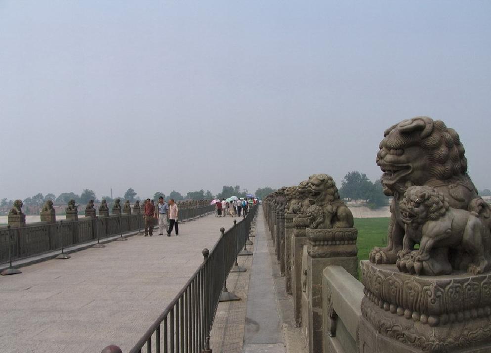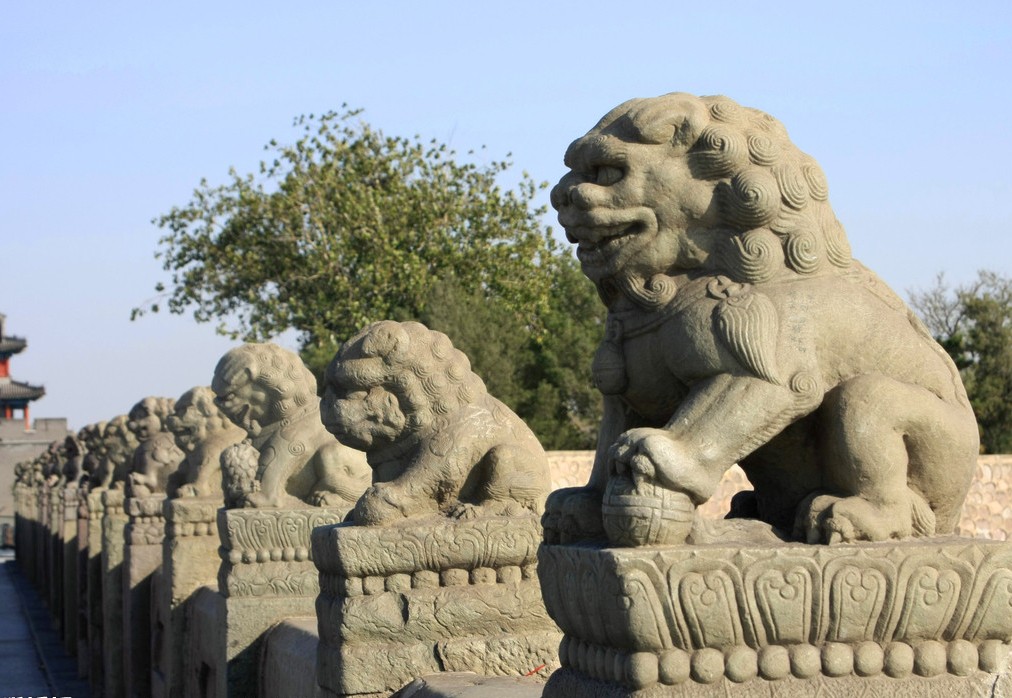 卢沟桥始建于1189年六月,明昌三年(1192年)三月完工。两侧石雕护栏各有140条望柱,柱头上均雕有石狮,形态各异,据记载原有627个,现存501个。石狮多为明清之物,也有少量的金元遗存。“卢沟晓月”从金章宗年间就被列为"燕京八景"之一。