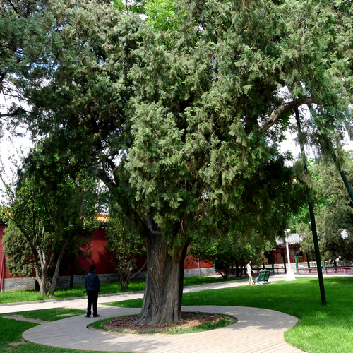 这棵槐树生于柏树树干的裂缝处,两棵树合长在一起,天然形成,被称为“槐柏合抱”。它是我园一处有趣的植物景观。
