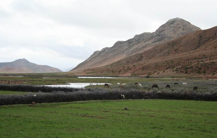 位处昌都地区三江流域之高山深谷中的邦达草原是一块地势宽缓、水草丰美的高寒草原。怒江支流玉曲上游蜿蜒流淌其中,两岸广阔的低湿滩地上生长着茂密低矮的大蒿草、苔草之类的草甸植物,绿茵如毡,除成群牛羊在那里游荡觅食外,偶尔也会有一些藏原羚出没于其间。图上所示为冬季时节的邦达草原,牧草已趋枯黄,显得有点萧索荒凉,缺少些许生机。然而因位处西藏东部,降水稍多于西藏中西部地区,牧草生长状况较好,这里是西藏境内较为优良的天然草场,畜牧业比较发达。