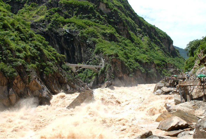 石鼓以下,江面渐窄,至左岸支流硕多岗河口桥头镇,往东北不远即进入举世罕见的虎跳峡。虎跳峡上峡口与下峡口相距仅16公里,落差竟达220米。平均坡降达13.8‰,是金沙江落差最集中的河段。峡中水面宽处60米,窄处仅30米并有巨石兀立江中,相传曾有猛虎在此跃江而过,故名虎跳石,虎跳峡也由此得名。峡内急流飞泻、惊涛轰鸣,最大流速达10米/秒。峡谷右岸为海拔5596米的玉龙雪山,左岸为海拔5396米的哈巴雪山,两山终年积雪不化。峡内江面不足海拔1800米,峰谷间高差达3000余米。峡中谷坡陡峭,悬崖壁立,呈幼年期“V”型峡谷地貌。