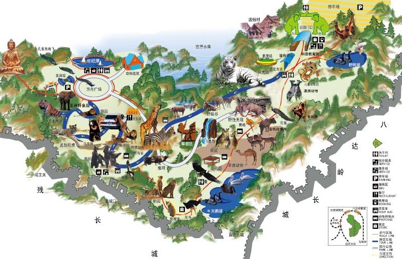 八达岭野生动物世界设计建有30处景区及一个小型水库,其中包括动物游览区20处;古迹游览区2处;表演场(馆)4处;植物观赏区1处;健身运动区2处。园内动物规模有47种达两千余只(头)。