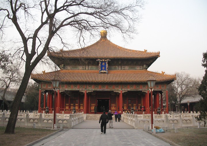 全国重点文物保护单位。位于北京城内东城区国子监街。占地2.2万平方米。历代多次重修,为元、明、清三代祭孔建筑,又名"先师庙"。庙坐北朝南,大门称先师门,仍保持元代风格。前有琉璃壁及下马碑,进门东西有碑亭、神厨、神库等,并立有元、明、清三代进士题名碑118 方,题刻历代进士5万多名。进大成门至第二进院,正殿名大成殿,为孔庙主体建筑,面阔9间,进深5间,黄琉璃筒瓦重檐庑殿顶,殿前月台三出陛,殿内供奉孔子及"四配"、"十二哲"。殿前有600余年树龄的古柏一株,名"除奸柏",亦名"触奸柏"。有古井一口,清高宗赐名"砚水湖"。大成殿后有崇圣祠,自成院落,为祭祀孔子先祖之地。今辟为首都博物馆,展出北京地区出土的历代珍贵文物。