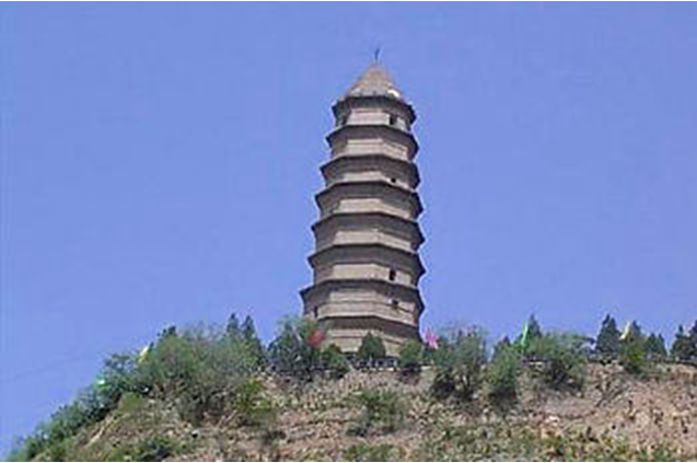 史称唐塔,原名大觉寺塔,始建于唐贞观十三年(公元639年),碑记为“尉迟敬德监建”,距今已1300多年。原塔为八角密檐式砖石结构,青砖到顶,飞檐挑角,角系铜铃,塔身13级,第一级南北各一门,其上每一级一南门,顶有相轮,全塔高约36米。明代维修时,吏部尚书杨巍撰有《重修大觉寺宝塔》,并刻石竖碑。清康熙七年(公元1668年)元月地震,大觉寺塔裂;光绪十四年(公元1888年)五月地震,塔圯其半,1957年,因塔身破损严重,有倒塌之虞,报省批准,将地表以上塔身拆毁。