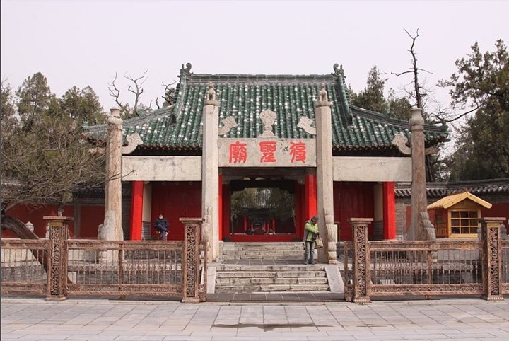 穿过第一进狭长的庭院,便是孔府中路的第二道大门,俗称二门。门建于明代,门楣高悬明代诗人、吏部尚书、文渊阁大学士李东阳手书“圣人之门”竖匾,下有阀阅承托,门柱有石鼓夹抱。正门左右各有腋门一座,耳房一间。在封建社会,平时只走腋门,正门不开,以示庄严。
