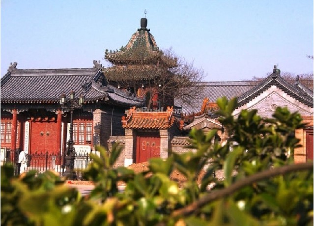 中殿由望月楼、南北便门、南北配殿、东耳房组成。版权所有山东聊城聊之旅国际旅行社有限公司,转载必究!望月楼为中院起点,下层为阁,砖砌石墙,饰圆窗,四周以12根方柱筑成围廊,上起四面飞檐,廊柱间加棱形花栏杆;上层为厅,全木结构,外有窄廊,可过人,四周围卐形花栏杆,顶部有木质浮雕腰板,垂花柱。此楼二层三蒙,重檐轿子顶(上层为重檐,下层为单檐),绿琉璃瓦罩顶。三层飞檐的饰物均为绿琉璃瓦制。