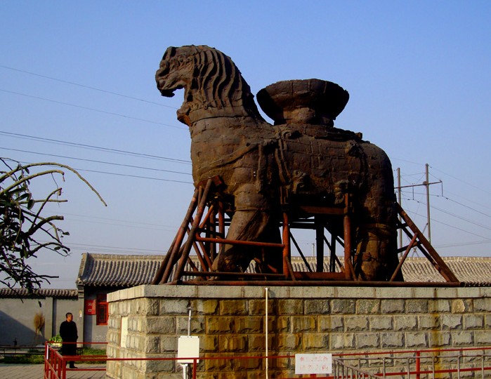 沧州铁狮子位于沧州市政府驻地东南偏北16.5公里。坐落在东关村西0.5公里处。铁狮身高5.78米,长5.34米,宽3.17米,体重约50吨。背负巨盆相传是文殊菩萨莲坐,狮身向南,头向西南,两左脚在前,两右脚再后,呈前进状,姿态雄伟,昂首阔步,徐徐如生铁狮是我国大型的惊巧铸铁工艺。也是我国著名发源的古迹。距今已有一千多年的历史,它充分的显示出我国古代劳动人民的智慧和艺术才华。解放后铁狮子受到了党和政府的重视与保护,国务院首先把它列为全国第一批重点文物保护单位,并且对它进行各种的修缮。