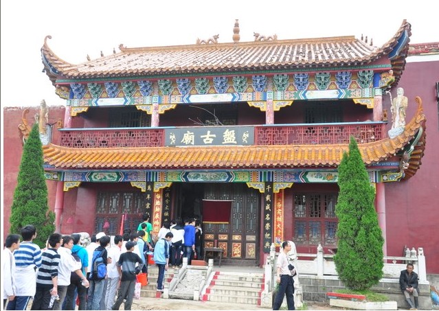 地处河北省沧州市北的青县城南6公里有村曰“大盘古”,村西有座盘古庙。盘古庙始建于元世祖至元十五年(1278年),明弘治和崇祯年间曾重修,清康熙二十七年(1688年)因河流冲刷,设于秋祠西南重建,均有碑记。据文献记载和民间传说,当年的盘古庙状似北京的故宫三殿,石、砖、木结构,琉璃瓦盖顶,金碧辉煌,蔚为壮观。前殿高三丈六尺,象征一年360天;台阶18级,为18层地狱之说;飞檐椽子108根,按36天罡、72地煞而布;每根椽头系铜铃一枚,照工、商、角、征、羽五音而置,有所谓“风摇铃响天动乐,光照殿顶地生辉”之说。殿内有身披树叶,手托日月的铁铸涂金盘古像,高一丈零八寸。中殿塑有南海观音像,股坐莲盆,金童玉女立两侧。版权所有山东聊城聊之旅国际旅行社有限公司,转载必究!后殿设老君、孔子、龙王三塑像,殿前有合抱粗的合欢树两株,殿后铁磬悬于古槐。可惜盘古庙在1947年毁于战火。九十年代,当地群众组织起来修复盘古胜迹,以满足来此朝圣拜祖的人流寻访。