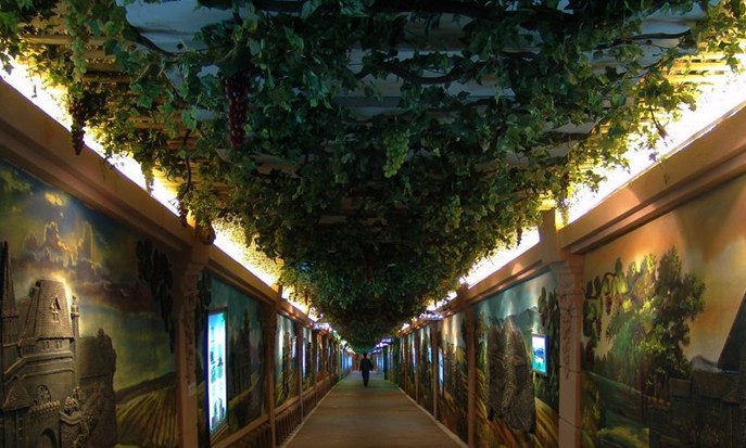 走进博物馆的大门,首先映入眼帘的是一条通道,通道两边的墙壁上挂满了各种宣传橱窗,在壁灯、吊灯的照耀下闪烁出五光十色的色彩,为了安全,博物馆的工作人员在通道的顶部安装了钢纱网,小细节体现出博物馆工作人员的缜密与仔细。整个博物馆以葡萄酒为主题,追溯了葡萄酒的起源和历史,展现了葡萄酒的文化与品质。在这里,真实再现了葡萄从种植到酿造成美酒的全过程及工艺流程,通过这些展品,使我这个对葡萄酒不太懂的门外汉也开始对葡萄酒有了初步的了解。