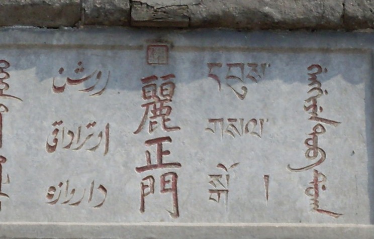 门前列石狮和下马碑,迎面有红照壁,门上有阁楼,下有3门,高敞宏伟。中门上方有乾隆题额“丽正门”三字,取《易经》“日月丽乎于天”之意,用汉、满、蒙、藏、维五种文字刻成。它和门内上方乾隆题诗“两字新题标丽正,车书恒此会遐方”,象征着国内各民族团结,国家强盛、统一。