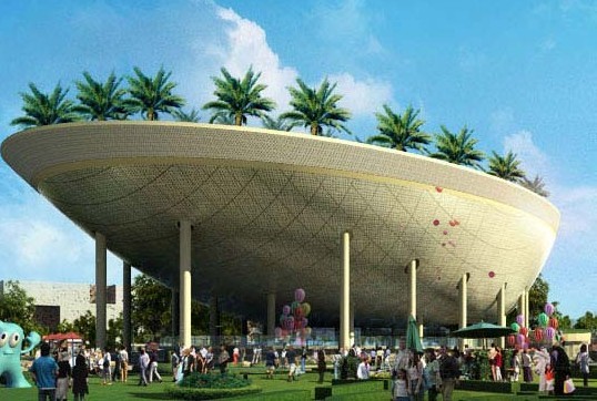 灵沙特阿拉伯展馆感来自于沙漠中的绿洲,主体建筑更像一艘高悬于空中的大船,底部和甲板种满了沙特标志性植物:枣椰树。
