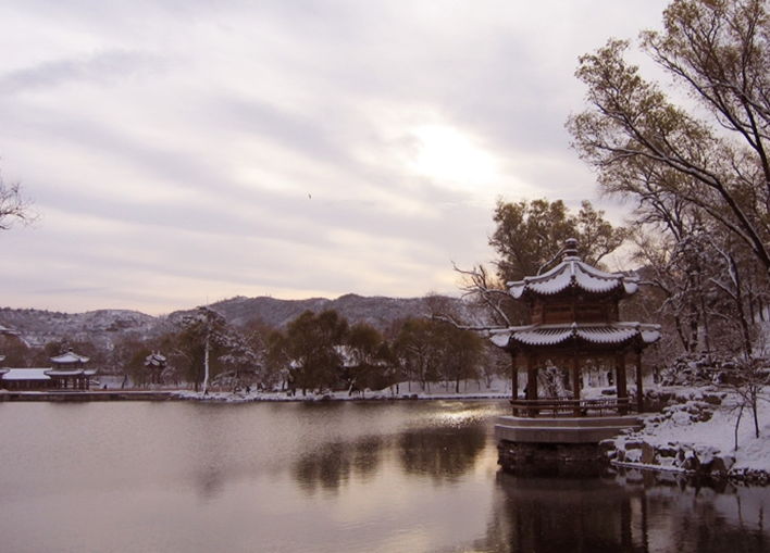 阁的东北部有水门与山庄水系相通,阁前池水清澈,人在阁前特定位置向池中望去,只见池中有一弯新月,随波晃动,而天空却是艳阳高照。原来这是造园家在池南的假山上,开出一个半圆形如上弦月的缝隙,利用光线,在水中形成下弦月的倒影,构成“日月同辉”的奇特景观。水池南岸是一座造型别致的假山,怪石嶙峋,气势雄浑。假山占地约800平方米,用石3279立方米,由浆石和鸡骨石等堆叠而成。假山石洞,前后各有两门相通,结构也颇具匠心。洞内山石遮掩,可分厅、堂、窗、孔、穴等,洞壁用鸡骨石镶嵌,幽深曲折。有几个大小不等的窗孔,透进幽幽的光线,使洞中的峭壁怪石若隐若现。山上横岭纵峰,沟桥岗壑,各自争奇。有棒槌山、罗汉山、双塔山等十大名山的缩影,更有“十八学士登瀛洲”的造型,还有仿米芾“宝晋斋”的园林布局。文津阁东为碑亭,四角攒尖顶,上覆黄琉璃瓦,内竖石碑一座,通高5.34米,碑正面镌刻着乾隆题《文津阁记》,其余三面刻有乾隆作的3首诗。文津阁庭院,由粉墙围绕,是山庄的园中之园。这组建筑,坐北朝南,依次布置着门殿、假山、水池、藏书楼、花台、曲池、山石、月门。东侧有碑亭和值房3间。阁前池水清澈,澄泓见底,水草丛生。池南假山呈半月形环抱池沼,版权所有山东聊城聊之旅国际旅行社有限公司,转载必究!拱峙搂阁,叠石大多仿承德十大景堆砌,与山庄西山浑为一体。假山上有赏月的月台,其西有趣亭(已不存)。假山上有磴道,下有洞府,入门进阁,必经此洞。石洞曲折幽邃,洞顶有一曲形石孔,光线漏射到池水中,恰如一弯新月,每当丽日当头,水池中却素月高悬,“抬头看日,低头观月”,日月同辉,景观绝妙,又为山庄一绝。