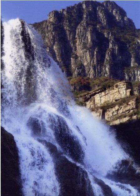 女妖洞口好似鱼口,呈椭圆形,高20余米,宽10余米,距崖底20米。洞内有地下暗河流淌,洞口常年往外流水,雨季洞水如柱,喷射而出,版权所有山东聊城聊之旅国际旅行社有限公司,转载必究!从20米高的悬崖峭壁上跌下来,落到20米外山坡上,涛声如雷,气势壮观。旱时水流如带,沿着裸露的岩壁流下,汇入崖底深潭。水潭方圆400平方米。深不见底,高耸的悬崖峭壁倒映在水中,湖光山色,如入画境。待到水位高涨,潭水漫过潭,顺山势直泻山底,一路上随着高低不等的落差,形成三道梯级瀑布,其中第一级瀑布宽5米、高10米,第二级瀑布宽7米、高20米,第三级瀑布宽3米、高30米,经过三级瀑布,潭水最终汇入东流的郊沟河中。