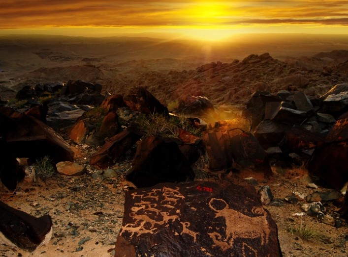 在阿拉善高原上有一座形状奇特的山脉,山上黑石嶙峋,岩脉蜿蜒,周围巨大的岩石皆成圆形,酷似陨石分布,一条崎岖小路不见尽头,这便是曼德拉山。蒙语曼德拉是汉语“升起来”的意思。专家考证,早在新石器仰韶文化时期,阿拉善大地上便有了人类活动的足迹。