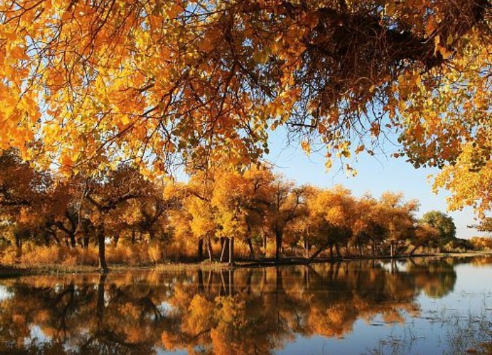 内蒙古阿拉善盟的额济纳旗,现有天然胡杨林45万亩,是世界仅存的三大胡杨林之一,是国家自然保护区和国家森林公园。胡杨林是一个古老的树种,被誉为“植物活化石”,有“生一千年不死,死一千年不倒,倒一千年不朽”的美誉。胡杨,又名“梧桐”,为古地中海残遗物种,属落叶乔木,蒙古语称为“陶来”。胡杨木质纤细柔软,树叶阔大清香,耐旱,生命力顽强,是自然界稀有的树种之一。金秋十月,额济纳是一个童话般的世界。胡杨金叶挂满枝头,细细看来,在树枝间竟寻不到一片异色叶子,密密匝匝,金光灿烂,至纯至美;远远望去,一片片金色的胡杨把大漠装点得如诗如画,汇集成金色的海洋,吸引着大批国内外宾客到此旅游、采风、摄影。