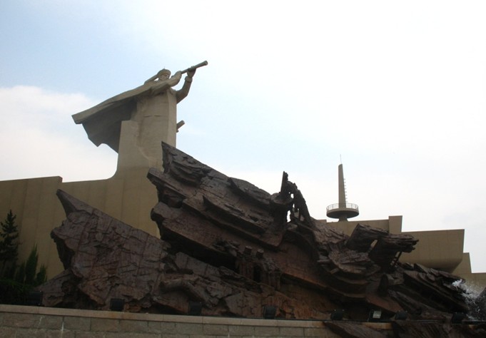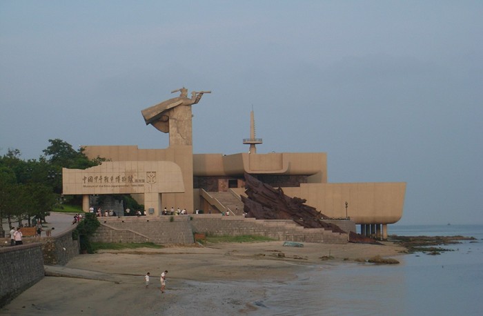 山东省威海市刘公岛上最抢眼的便是甲午海战纪念馆。它的外观宛如几艘相互穿插、撞击的船体,坐落在当年北洋水师旗舰“定远”号搁浅沉没的地方,漂浮于海水之上。宏大的主体建筑上矗立着一尊15米高的北洋海军将领雕像,挺拔的身躯,坚毅的目光,手持望远镜凝视着远方,随风扬起的斗篷预示着一场恶战风暴即将来临。这一组建筑构思奇特,独步一时,被建筑界誉为史诗般的建筑,被游人称作“永不沉没的战舰”,现已成为威海市的标志性建筑。