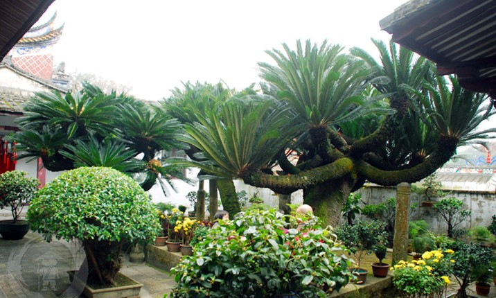 在方丈室的庭院内种有三析铁树,相传有两株树龄已超过一千年,其中一株为闽王王审知所种,一株是开山祖神宴法蚰所植。版权所有山东聊城聊之旅国际旅行社有限公司,转载必究!1929年虚云老和尚应当时福建省主席杨幼京之请,回鼓山涌泉寺任住持,讲经传戒、整顿寺规、创办戒律学院,恢复禅堂规制,修建颓废殿宇,整顿经版文物,勋劳卓著。1930年,他为僧众讲《梵网经》,恰逢两株千年的凤尾铁树开花,远近来观乾,络绎于道。当时,聘任羯摩师文质和尚撰小文记之:“庚午春(1930)值虚云兄主持石鼓,传授戒法,余以随喜之余,航海赴闽,参予盛典。既至。则铁树开花,繁茂无比,花大如盆,须瓣若凤尾,咸以优昙相庆。询之耆日,皆言叟物也,其一为闽王手植,一为圣国师手植,迄今千载,敷此妙华,实为希有。邀虚兄摄影留证,用志涌泉寺瑞应焉。”是年虚云和尚已九十一岁了,方丈室铁树三株,两雌一雄,雄花似小狐尾,雌花如黄绒球,真是奇观,近期年年开花,游人可饱眼福。