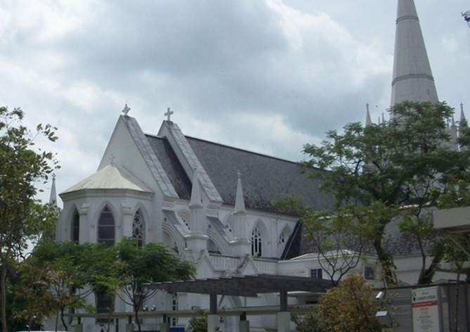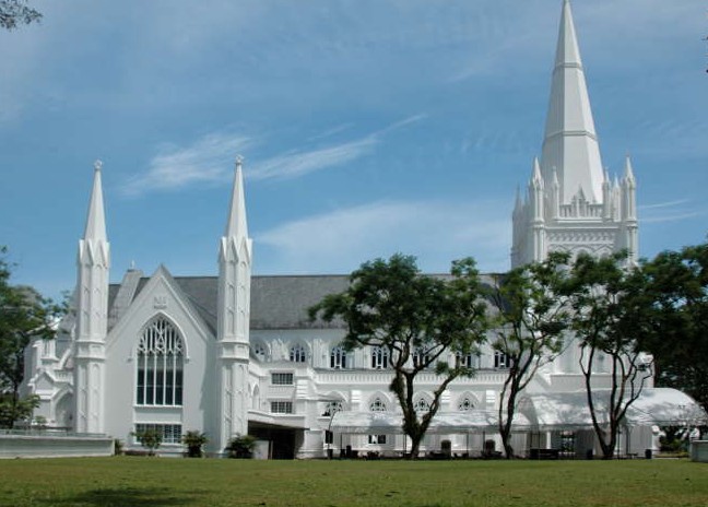 一座洁白的歌特式教堂,高高的尖顶直插蓝天。像一位高大而圣洁的神的使者,他默默伫立在喧嚣的市中心,却让每一个见到他的人,心中都会不由自主地生起向往和敬畏。这就是新加坡最著名的一座教堂——圣安德烈教堂。 洁白亮丽的外墙是圣安德烈教堂最傲人的特点之一。经历了一百多年的沧桑却仍旧那么光彩照人,“就是青春无瑕”,传说肌肤胜雪的圣安德烈教堂,据说是将贝壳磨成灰,加入蛋白和糖调成糊状,再放入浸泡到柔软的椰子壳,就制成了一种实用又美观的石膏。将其涂在建筑的表面,不容易出现裂痕,而且洁白有光泽。