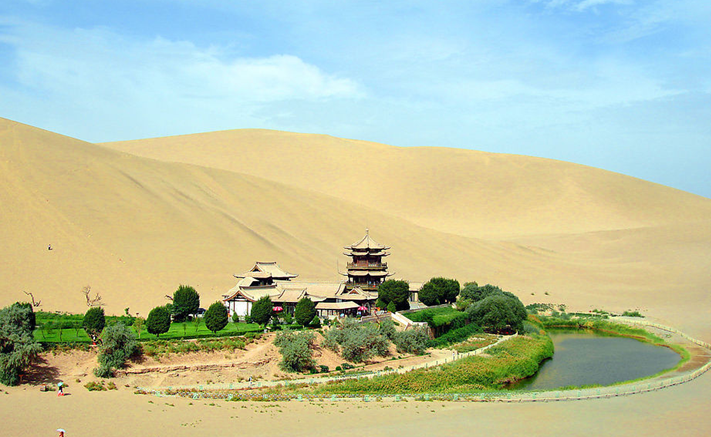 月牙泉位于敦煌市西南5公里处,是一处神奇的漫漫沙漠中的湖水奇观。鸣沙山下,泉水形成一湖,在沙丘环抱之中,酷似一弯新月而得名月牙泉。月牙泉,古称沙井,俗名药泉,泉边芦苇丛生,水中鱼儿自在,胡杨沙枣绿树成荫,罗布麻、枸杞等药用植物丰茂,亭台楼榭古香古色,春夏季节百花盛开,夏秋季节梨果飘香。自汉朝起即为“敦煌八景”之一,得名“月泉晓彻”。月牙泉南北长近100米,东西宽约25米,泉水东深西浅,最深处约5米,弯曲如新月,因而得名。一湾清泉,涟漪萦回,碧如翡翠。泉在流沙中,干旱不枯竭,风吹沙不落,蔚为奇观。历代文人学士对这一独特的山泉地貌、沙漠奇观称赞不已。月牙泉因“泉映月而无尘”、“亘古沙不填泉,泉不涸竭”而成为奇观。“晴空万里蔚兰天,美绝人寰月牙泉,银山四面沙环抱,一池清水绿漪涟”。 月牙泉有四奇:月牙之形千古如旧、恶境之地清流成泉、沙山之中不淹于沙、古潭老鱼食之不老。版权所有山东聊城聊之旅国际旅行社有限公司,转载必究!去鸣沙山月牙泉游玩以傍晚、黄昏时分最佳。月牙泉有三宝:铁背鱼、五色沙、七星草,传说铁背鱼和七星草一起吃可以长生不老!月牙泉南岸的小花罗布红麻是泉边独特而唯一的保健中草药,也有延缓衰老的功效,每年6,7,8月小花盛开,犹如夜幕中的点点繁星,版权所有山东聊城聊之旅国际旅行社有限公司,转载必究!根据老辈人的说法:敦煌特有的狗鱼也许就是铁背鱼,月牙泉南岸的罗布麻或许就是传说的七星草! 月牙泉处于鸣沙山环抱之中,面积 0.88公顷,平均水深3米左右,水质甘冽,清澈如镜。千百年来沙山环泉而不被掩埋,地处干旱沙漠而泉水不浊不涸,实数罕见。泉内星草含芒、铁鱼鼓浪,山色水光相映成趣,风光十分优美。