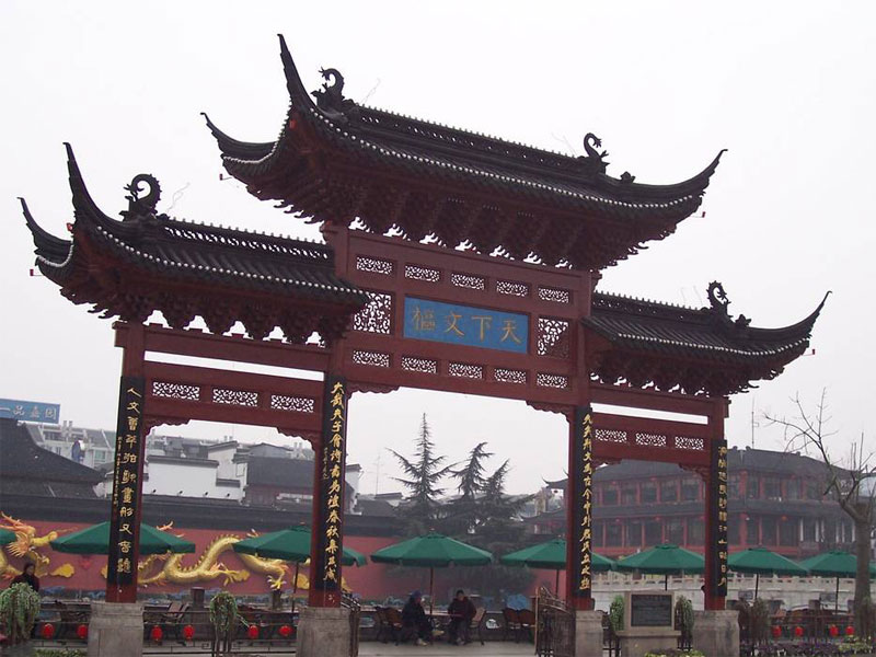 秦淮河是古老的南京文化渊源之地,而内秦淮河从东水头至西水关全长4.2公里的沿河两岸,从六朝起便是望族聚居之地,商贾云集,文人荟萃,儒学鼎盛,素有“六朝金粉”之誉。自六朝至明清,十里秦淮的繁华景象和特有的风貌,曾被历代文人所讴歌。 夫子庙位于秦淮河北岸,原是祀奉孔子的地方,始建于宋代景祐元年(公元1034年),是就东晋学宫旧址扩建而成。元代为集庆路学,明代为应天府学,清代将府学 迁至城北明国子监旧址,这里便成为江宁、上元两县县学。咸丰年间毁于兵火,同治八年(公元1869年)重建。抗日战争时被日军焚毁。古时立学必祀奉孔子,其各地的孔庙,属于国家祀典内容之一。所以孔庙的特点是庙附于学,和国学、府(州)县学联为一体。庙的位置或在学宫的前部,或偏于一侧。