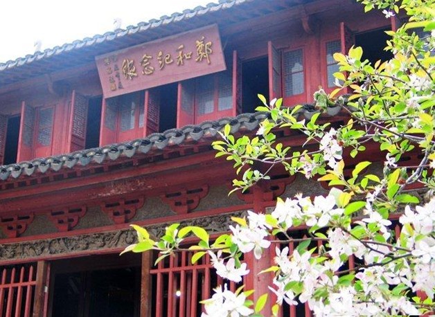 大门之内立有“郑和故里”牌坊,其后,参天树丛中掩映着郑和纪念馆,陈列有郑和下西洋的碑文拓片、石刻以及航海用具等文物。