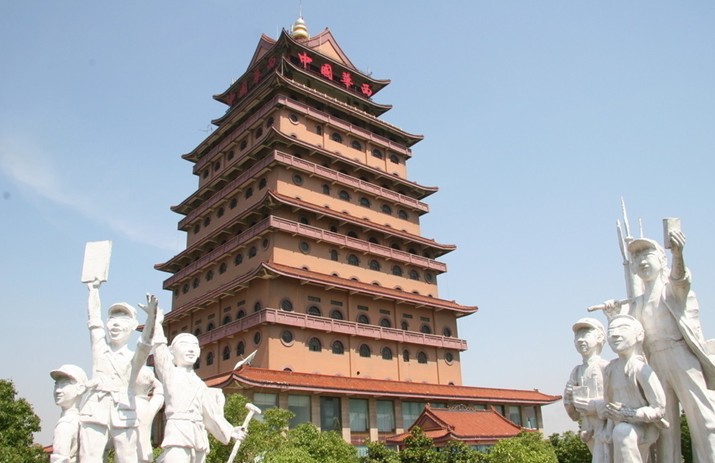 有座下宽上窄、四方形、17层、每层都有飞檐的建筑,华西人称之为“金塔”。金塔建于1996年,耗资12000万元人民币。版权所有山东聊城聊之旅国际旅行社有限公司,转载必究!这是一座宾馆。在没有高楼的华西村,金塔成为华西的标志性建筑,在村中显得非常醒目。塔上挂着“中国华西”金字横匾。省略了省,也省略了市,“中国”之下便是“华西”,足见“天下第一村”的知名度之大。塔顶上那熠熠生辉的金黄色葫芦,用35公斤黄金镀成。大门口还安放着一座铜雕,是一头“牛气冲天”的金牛,脚下是地球。这“金牛踩地球”便是华西村的“村标”。