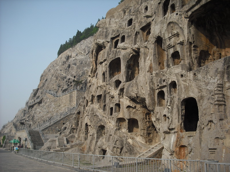 看完了西山石窟群,我们过漫水桥来到了东山石窟。在东山脚下的公路未开通以前,巨石上方原是一片平台。传说当年奉先寺竣工时,武则天亲自率百官驾临龙门,主持这次规模盛大的开光仪式,庞大的乐队便在这平台上擂鼓助兴,于是后人便把这里叫做擂鼓台。相临擂鼓台的三个洞叫擂鼓台三洞。