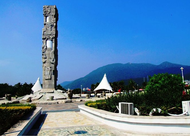 亚龙湾中心广场,位于三亚市东南28公里处。广场以图腾柱向蓝天升腾,以雕塑群向大地和大海延伸,其宏伟气势和独特的艺术造型,以有限的艺术空间形式,引导我们的想象向无限的空间扩展。屹立的图腾柱是广场的最高点,高26.8米,由200多块巨大的花岗石和直径2.5米的铝合金柱组成。上面雕刻有龙、凤、太阳鸟、鱼以及风雨雷电四神的图案。 围绕图腾柱的中心雕塑区,形成三圈石砗,气势宏大、形象独特:第一圈有苍龙、白虎、朱雀、玄武四季标识与日晷24节气雕塑;第二圈表现盘古开天地、女娲补天、嫦娥奔月、弄天舞干戚、大禹治水、牛郎织女、后羿射日、夸父追日等八个远古神话;第三圈反映天文、人、动物、植物万物生灵及八位中国古代之神。图腾柱和雕塑群浑然一体,构成强烈的中国古天文意识和东方神秘色彩。广场外围设计的五组白色风帆式的尖顶帐篷及大型彩色喷泉,给具有古老文化意蕴的雕塑增添了现代气息。