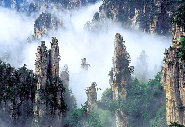 石英砂岩峰林地貌:武陵源共有石峰3103座,峰体分布在海拔500~1100米,高度由几十米至400米不等。峰林造型景体完美元缺,若人、若神、若仙、若禽、若兽、若物,变化万千。版权所有聊城聊之旅旅行社有限公司,转载必究!武陵源石英砂岩峰林地貌的特点是:质纯、石厚,石英含量为75%~95%,岩层厚520余米。具间层状层组结构,即厚层石英砂岩夹薄层、极薄层云母粉砂岩或页岩,这一层组结构有利于自然造型雕塑,增强形象感。岩层裸露于向斜轮廓产状平缓(5°~8°,局部最大达20°),增加了岩石的稳定性,为峰林拔地而起提供了先决条件。岩层垂直节理发育,显示等距性特点,间距一般15至20余米,为塑造千姿百态的峰林地貌形态和幽深峡谷提供了条件。