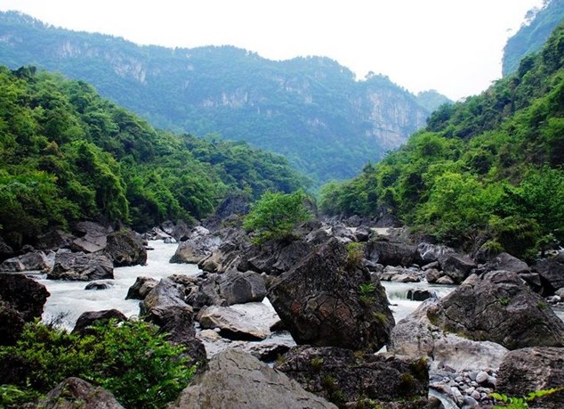 景区内植被茂密,覆盖度高,植被类型较丰富,大部分为亚热带原生性较1强的次生林。在河谷两侧斜坡上有原生性较强的石灰岩山地常绿、落叶阔叶混交林和竹林;在河流周期性淹没的河漫滩上以及河流两岸水边,有以窄叶蚊母树、长柄竹叶榕、河滩冬青及二翅六道木为优势的河滩灌丛;在河谷以上低中山黄壤分布地区,有以马尾松林为优势的人工针叶林。风景区内植物种类丰富,有维管束植物414种,分别隶属275属116科。其中有不少种类的珍稀植物,如国家一级重点保护植物红豆杉、国家二级重点保护植物榉树、香果树、木荚红豆树、三尖杉、银杏等。