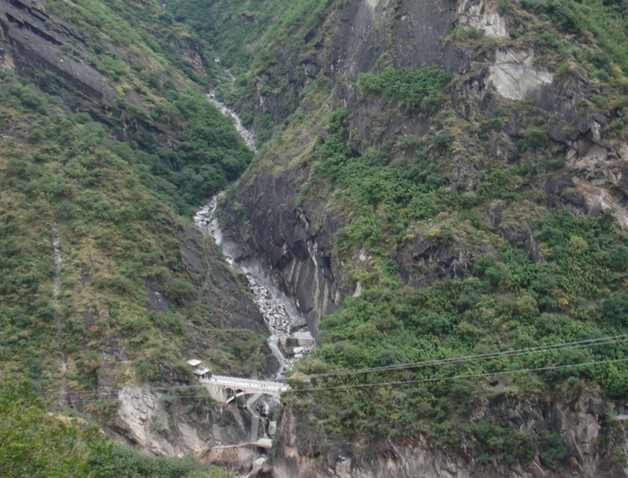 从中虎跳过险境“滑石板”,即到下虎跳。下虎跳有纵深1公里的巨大深壑,这里接近虎跳峡的出口处,是欣赏虎跳峡最好的地方。