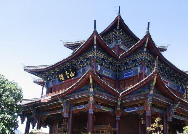 木牌坊上大书“天雨流芳”四字,乃纳西语"读书去"的谐音,体现了纳西人推崇知识,重视教育的灵心慧性;石牌坊"栋梁斗拱,通体皆石,坚致精工,无与敌者",是国内石建筑的精品;议事厅端庄宽敞,气势恢宏,是土司议政之殿;万卷楼集两千年文化遗产之精粹,千卷东巴经,百卷大藏经、六公土司诗集、众多名士书画,皆是翰林珍奇,学苑瑰宝;护法殿又称后议事厅,是土司议家事之殿;光殿楼乃后花园门楼,史称其建筑"称甲滇西";玉音楼是接圣旨之所和歌舞宴乐之地;三清殿是木氏土司推崇道家精神的产物。而狮山古柏深处,还有木氏土司祭祖,祭天,祭大自然神"署"的杜宗教活动场所。