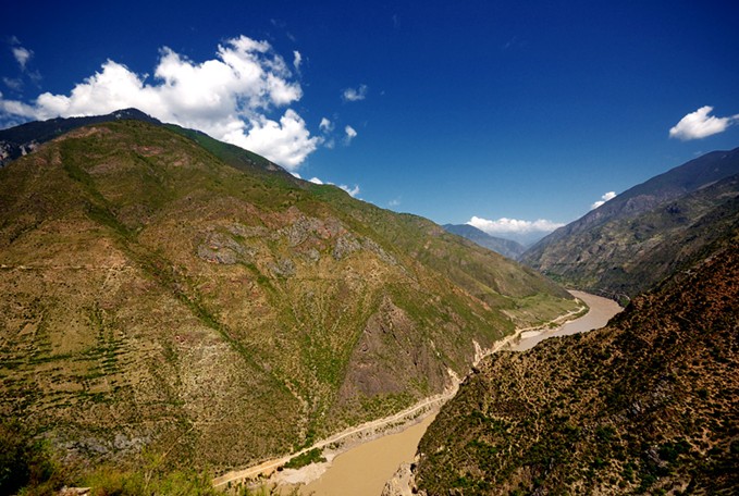 金沙江由北东去,汇集雅垄江、大渡河、嘉陵江,于是中国便有了长江。澜沧江由北南下缓缓而流,穿越国界便成了邻国湄公河的上游。怒江山北南下奔腾急湍闯进缅甸便成了萨尔温江的上游。三江同发源于青藏高原,三江携手并肩在云南崇山峻岭中奔流。而金沙江经石鼓镇天造奇观(长江第一湾)急转回头大江东去最终流入太平洋……而澜沧江、怒江穿流缅甸、越南、老挝、泰国最终流入印度洋……