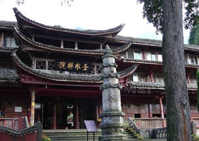 峨眉山圣水禅院原名神水庵、神水阁,有五重殿宇,全寺的殿堂和附属房屋全系木制结构。