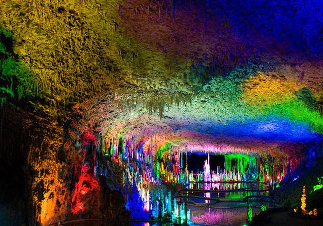 开放游览主洞第三层、第四层,面积8.l万平方米,分为穹庐广厦、长廊石秀、云步通幽等7个大厅。各大厅景观别具一格,钟乳、石花、石纬、石柱等组成琳琅满目、五光十色的景致。主洞内有宽敞的大厅,也有迂回的长廊;有对峙的"高山",也有卧波的"长桥";各种钟乳石岩溶于奇异状,瑰丽万端,宛如一个金碧辉煌的地下宫殿。主洞两旁又有耳洞、吊洞等10余个大溶洞,上下交错,版权所有山东聊城聊之旅国际旅行社有限公司,转载必究!形成洞中有洞、洞下有洞的奇观,并有阴河穿流其间。阴河河水清澈,鱼儿漫游,有发出微微磷光的亮虾;有珍稀的玻璃鱼,形如蝌蚪,小巧玲珑,颜色粉红,全身透明,肝胆可见,听觉灵敏,难得一见。