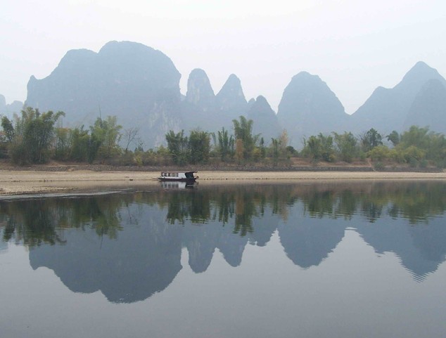黄布倒影是漓江精华中的精华,位于漓江83公里精华段兴坪古镇境内,游船经过杨堤,过了九马画山,江面逐渐开阔,水平如镜,青峰倒影,美不胜收。离画山之南不远,便是黄布滩。漓江山色之美,美在倒影中;漓江倒影之美,就数黄布滩倒影最为醉人。这里江流清澈,碧绿透底,从水面上可以看到江底有块米黄色的大石板,长、宽各数丈,恰似一匹黄布平铺在河床之上,黄布滩由此得名。