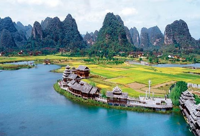 作为国家AAAA景区、全国首批农业旅游示范点和世界旅游组织的推荐旅游地,阳朔世外桃源景区向我们展示了一幅古桥、流水、田园、老村与水上民族村寨融为一体的绝妙画图。阳朔“世外桃源”主要有荷花池、燕子湖、燕子洞、侗乡风情和原始部落组成。