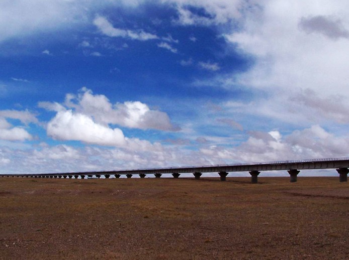 万丈盐桥道宽路长,风光无限。人们乘车来到这里,只见笔直坦荡的路桥,象一把利剑将浩瀚的盐湖一劈两半。盐桥两旁有钾肥厂的厂房,宿舍,有沟壑一般的采矿点,不远处还有举世闻名的青藏铁路,一列列长蛇似的火车,吞云吐雾,鸣鸣吼叫着从湖面上飞驰而过。