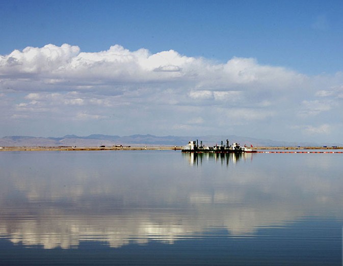 在约20万平方公里的柴达木盆地中,有一种独具特色的自然景观,这就是星罗棋布的盐湖。这些盐湖,有的与雪山为邻,把绵延的山峦和皑皑的白雪倒映湖中;有的静卧在荒漠里,四周围绕着白色的盐带,宛若戴上皓玉似的项圈;有的表面已干涸,结为坚硬的盐石,铁路公路从上面通过。盐石千姿百态,大有云南石林的风采。盐湖水中含有多种化学元素,蕴藏着巨大的无机盐矿产资源。