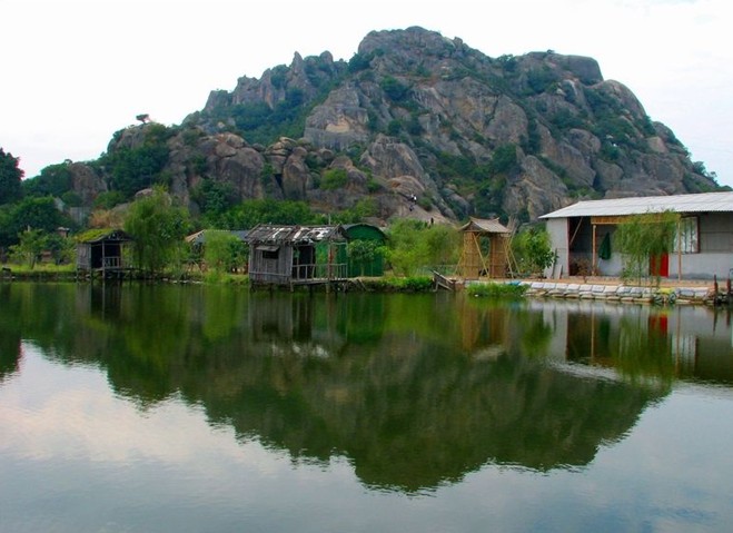 从梅林湖西登岸,经过石壁崖,游赏一线天,仰望“孙悟空”石,遥望猪头洞,初入佳境。行行来到牛头山,山脉从揭东县伸入,以状似牛头得名。抬头望,一巨石凌空耸立,这便是经常出现在《庵埠新闻》序景中的铁砧石。这是一块风蚀花岗岩,它上大下小,顶面略平,酷似打铁的砧。这“铁砧”头重脚轻,一面又濒临峡谷,却能稳立在另一块巨石上,真是奇观。